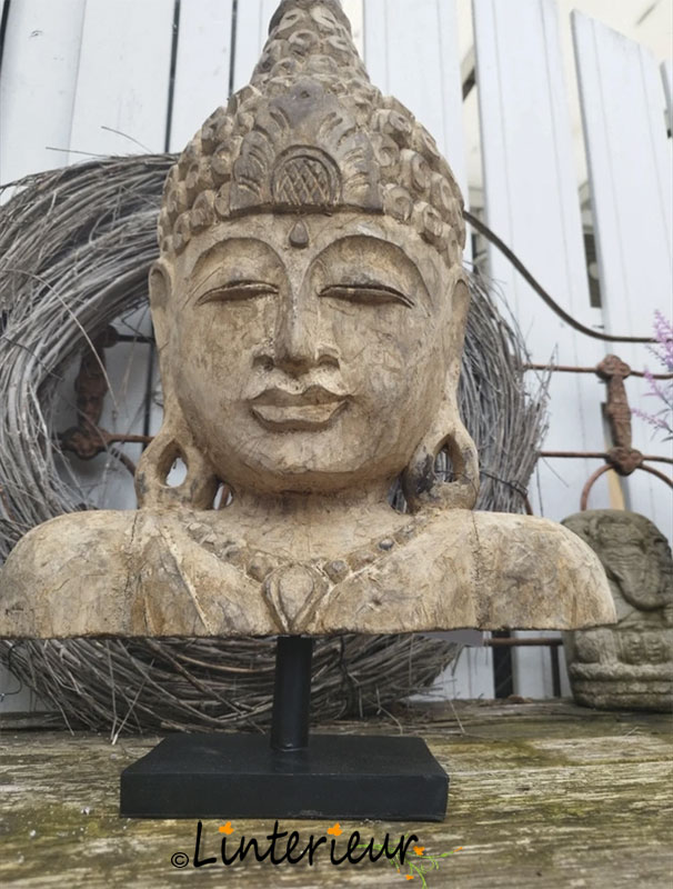 Wunderschöne, helle Holzstatue eines Buddha-Gesichts auf einem Ständer.